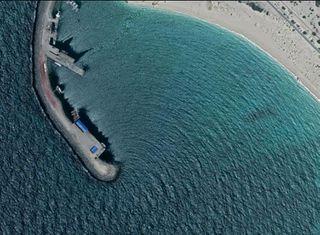 Wave diffraction around the tip of a breakwater. Image Google Earth.