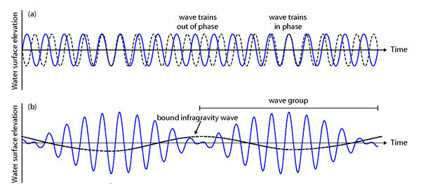 Infragravity waves are indirectly formed by the wind. Their genesis is linked to the presence of short-wave groups, which are formed due to the superposition of short-wave trains, with slightly different wave lengths and frequencies. When the waves are in phase, their amplitudes are added, and when they are out of phase, their amplitudes damp each other out (Fig. 2a). This results in a wave group structure (Fig. 2b), which is irregular in shape due to the various frequencies present in a natural wave field.
