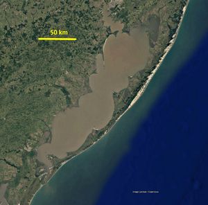 Kjerfve (1986[6]) distinguished three types of lagoons: choked lagoons, restricted lagoons and leaky lagoons. Choked lagoons occur along coasts with high wave energy and significant littoral drift. They are connected to the sea by a single long narrow entrance channel and may consist of a series of connected basins. An example (Lagoa dos Patos, Brazil) is shown in Fig. 2. Restricted lagoons are generally large, shore-parallel, relatively wide water bodies with several inlets. Fig. 3 shows one of the inlets of Pamlico Sound, a large restricted lagoon on the US Atlantic coast. Leaky lagoons have multiple ocean entrance channels along coasts where tidal currents are strong enough to counteract wave action and littoral drift that would otherwise close the inlets. Examples include the Wadden Sea and the lagoons along the shore of Cape Cod (Fig. 1).