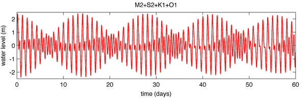 The various cycles in the relative motions of moon, sun and earth surface generate tidal oscillations at specific compound frequencies of these cycles. The lunar semidiurnal tidal component [math]M_2[/math] (period [math]\approx[/math] 12 h 25 min) is generally the largest tidal component, followed by the luni-solar diurnal constituent [math]K_1[/math] of 23 h 56 min (the sidereal day). Other important tidal constituents are: