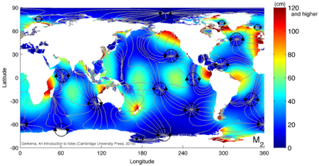 Fig. 3. Global map of the principal lunar semidiurnal component ([math]M_2[/math]), with amplitude in centimeters, indicated in color. Co-phase lines (i.e., lines connecting points of equal phase) are shown in grey. Lags between neighboring lines represent a phase difference of 1/12 of the [math]M_2[/math] period (i.e., slightly more than one solar hour). Figure generated using Aviso+ products. Color version of a figure from Gerkema (2019)[2]. |