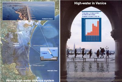 Various actions undertaken to enhance the industrial development of the city, together with natural phenomena, sea level rise and subsidence have led to a pronounced process of sinking of the city, about 23 cm in the last century, and an increased frequency of high tides. After a 30 year long debate, the political decision has finally been taken to built a mobile barrier system between the lagoon and the sea. The system includes mobile flood barriers at the lagoon inlets in order to isolate the lagoon from the sea in the case of high tides and raised lagoon banks and pavements in areas that lie lowest.