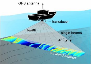 The echosounder is towed back and forth by a ship to survey or analyze the seabed over a larger area. The beam can be wide (“wide beams”), allowing a relatively larger surface area to be covered, but at the expense of image quality. More expensive “narrow beams” provide a clearer image but cover a smaller zone. Partly because one system provides too low an image resolution and the other covers too small an area, the singlebeam method is not efficient enough for scanning entire regions. The method has limitations in both time and space, meaning that only a partial picture can be obtained of, for example, fish dynamics and abundance.[4]