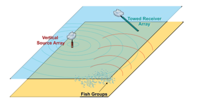 Acoustic signals are transmitted by several vertically suspended sources. These signals are reflected by both the sea surface and the seabed, creating so-called waveguide modes, or vertical standing waves, that span the full water depth. Because the waves spread outward in a circular pattern from their source, a large three-dimensional area can be scanned. The frequencies used are close to the resonance frequency of the swim bladder, which causes most fish with swim bladders to produce strong echoes. These echoes are received by an array of receivers towed behind a ship.