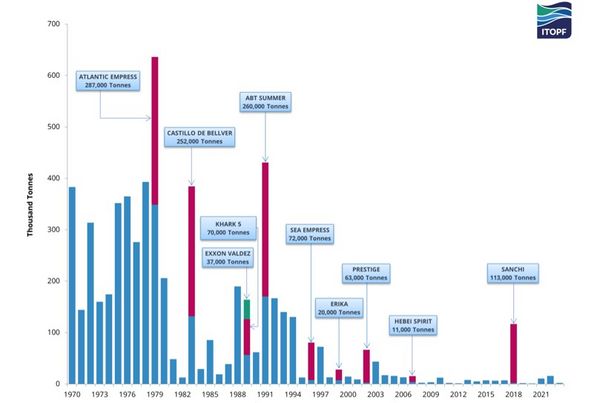 Accidental tanker spill statistics up to 2023 are shown in the figure below. Large accidental oil spills are marked with red bars. The volume of accidental spills has decreased significantly over the past three decades, with the vast majority of spills being less than 7 tonnes.