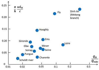 Infill of estuaries is limited by sediment export through river flow, although dredging may also play a role. The influence of river flow on sediment export can be represented by the nondimensional parameter [math]Q_R/Q_{tide}[/math], where [math]Q_R[/math] is the mean river discharge and [math]Q_{tide}[/math] the maximum tidal discharge in the mid-estuarine zone ([math]x \approx L_b/2[/math]). For estuaries in morphological equilibrium, sediment import due to tidal asymmetry (flood dominance) should be approximately balanced by export due to river flow. Comparing different estuaries one may thus expect a positive correlation between the parameters [math]a L_b \omega / (h c)[/math] and [math]Q_R/Q_{tide}[/math]. As shown in Fig. 10, such a positive correlation exists, although the spread in the data is large. This spread can be due to many other factors, which influence sediment import and export in different ways. Possible important factors are[1]: