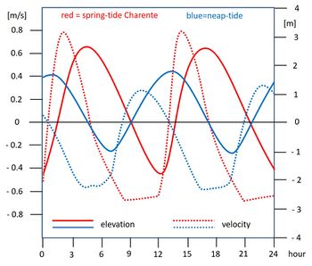 Figure 8: Tidal elevation (solid) and current velocity (dotted) curves in the Charente estuary for springtide (red) and neap tide (blue). The spring tidal curves exhibit a steep tidal rise and flood currents that are stronger than ebb currents. Hardly any tidal asymmetry occurs during neap tide and ebb currents are stronger than flood currents. Data from Toublanc et al. (2015) [24]. Characteristic parameters for the Charente estuary are: channel depth [math]h \approx[/math] 6.5 m, convergence length [math]L_b \approx[/math] 10 km.
