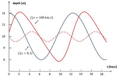 The expressions (17) and (18) show that tidal wave propagation depends on only two parameters, [math] K_0[/math] and [math] K_c [/math]. It should be noted that the linear equations (15) and (16) do not describe tidal wave deformation; for this, nonlinear terms have to be included ([math]u \partial u /\partial x[/math] and time varying water depth [math]h+\zeta[/math] in Eq. (15) and [math]b \zeta \partial u / \partial x[/math] in Eq. (16)).
