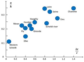 Figure 9: The relative tidal amplitude [math]a/h[/math] and corresponding relative difference between HW and LW propagation speed [math]\Delta c / c[/math] for different estuaries, derived from tide gauge stations in the converging part of the estuary. Adapted from[1].