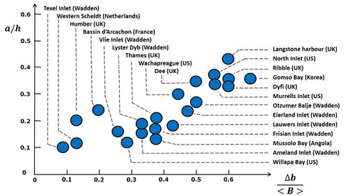 Figure 5: The relative tidal amplitude [math]a/h[/math] versus the relative intertidal area [math]\Delta b/\lt B\gt [/math] for a large number of tidal basins with small (or without) river inflow. Many of these basins (but not all) are back-barrier tidal basins or tidal lagoons: basins that are semi-closed by a sand barrier at the entrance. The figure shows a positive correlation between [math]a/h[/math] and [math]\Delta b/\lt B\gt [/math]. The correlation between these basin characteristics also depends on other parameters, in particular the tidal asymmetry already existing at the basin entrance, which is different for each basin. Therefore, one should not expect that all the point lie on a single line. Adapted from[1].