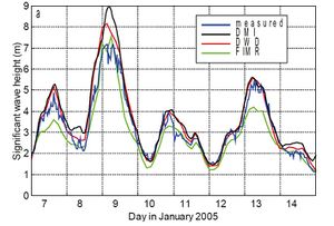 A spectacular application of the regional model for North Sea and Baltic is the investigation of the severe storm Gudrun, an extra-tropical cyclone that crossed over northern Europe in January 2005 and left behind extreme destruction in Scandinavia and the Baltic countries. Besides a storm surge at the coasts of the Baltic countries, the operational numerical regional wave forecast of the DWD predicted unusually high waves for the Baltic Proper and the Gulf of Finland. Fig. 5 shows the distribution of the significant wave height and the corresponding wind speed and direction in the LSM model area during the storm peak. The maximum wave height of about 11 m near the coast of Lithuania is emanated from a forecast released on January 8th 2005 at 12 UTC. A hindcast for the same time period, driven by the analysed wind fields of the local atmospherical model of the DWD provided a maximum wave height of about 10 m, which seems to be more realistic. Measurements were available during that period at 3 locations, one in the open Baltic Proper and two in the Gulf of Finland. Fig. 6 includes a time series plot for the measured and computed significant wave heights at the buoy location FIMRB (59°15' N, 21°00' E) in the Baltic Proper. Besides the results of the DWD model, the measurements have also been compared with the results of the forecast models of the Danish Meteorological Institute (DMI) and the Finnish Institute of Marine Research (FIMR). The maximum measured significant wave height is about 7 m at the storm peak at 3 UTC on January 9th 2005 and is well predicted by the forecast models. This example shows how important high quality wave forecasts are. To know about such dangerous wave conditions already two days in advance can save lives and prevent economical damages.