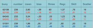 The impact of the data assimilation on the fields of the global model GSM has been determined by comparing the results of two runs for the time period September 1st to September 30th 2007. The only difference in these runs was the data assimilation in one of the two. Fig. 4 shows the distribution of the difference of the significant wave heights obtained with data assimilation and without for September 3rd 2007 at 0 UTC. It is obvious that the general trend of the assimilation effect is an enhancement of the wave heights, especially in the southern hemisphere. Maximum differences occur on that day south- west of Australia (up to 4 m), south of Africa and east of Japan. A statistical analysis of the results of both runs in comparison with measurements at the 138 buoy locations shows an improvement due to the assimilation in 60.2 % of all cases for September 2007. The impact of the assimilation on the statistics is shown at three selected buoy locations in Table 1, two in the Atlantic and one in the Pacific. These comparisons are representative for all of the 138 buoys. The trend of the increased wave heights is confirmed by the bias (measurements - model results). The negative bias decreases for the two Atlantic locations and therefor all the statistical checks. .