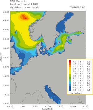 The wave forecasting system is based on the third generation WAM Model (WAMDI, 1988[1]; Komen et al., 1994[2]). This community model was developed by the international WAM group and is maintained and distributed worldwide by GKSS. Wind fields predicted by the atmosphere model of the DWD force the wave model. It accounts for wave propagation on a spherical grid and modifies the waves due to refraction and shoaling. Wave dissipation is done by white capping and bottom friction. The non-linear wave-wave interaction is implemented by the DIA approximation. Sea ice fields provided by the Bundesamt für Seeschifffahrt und Hydrographie (BSH) are used in the operational set-up to dissipate the wave energy in the ice covered areas.