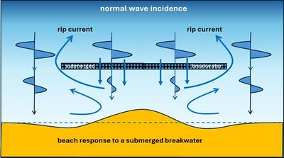The elevated sea levels at the shore drive seaward directed currents (so-called rip currents) through the gaps between breakwaters[2][3] (Fig. 3). These currents are dangerous for bathers and produce important scour at the extremities (roundheads) of the breakwaters. The eroded sediment is deposited at the seaward flank of the low-crested breakwater[4]. In periods of high incident waves, rip currents cannot rapidly evacuate the water piled up against the shore, unless the gaps between low-crested breakwaters are very large. Under storm conditions, this wave-induced set-up adds to the water level set-up by winds and low air pressure. Low-crested breakwaters therefore increase flooding risks of homes and infrastructure on the coast[5].