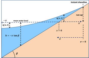 Here is (Fig. 1): [math]\; \eta(x,t)=[/math]wave surface elevation, [math]u(x,t)=[/math]wave orbital velocity, [math]g=[/math]gravitational circulation, [math]\beta \approx \tan \beta =[/math]bed slope, [math]t=[/math]time coordinate.